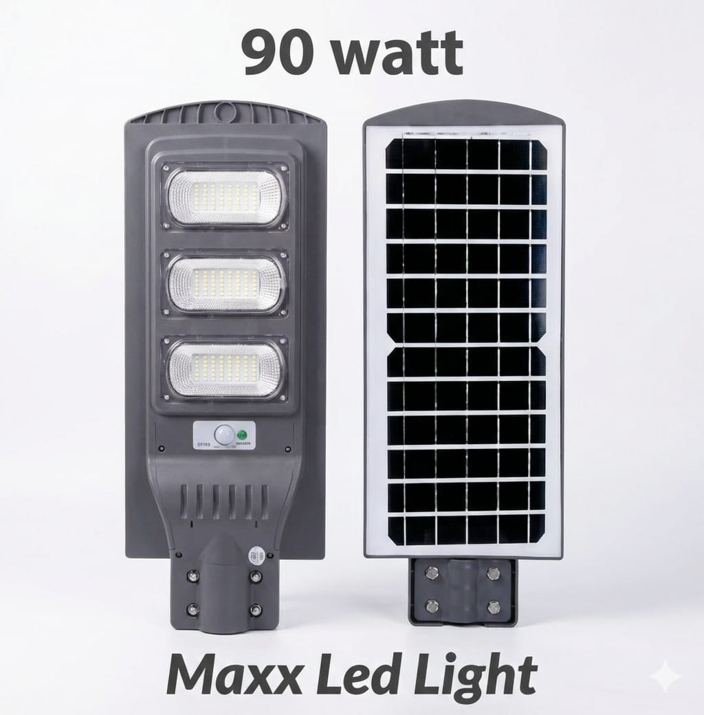 Solar Street Light 90 Watt by Maxx Led Light is a powerful, energy-efficient, and maintenance-free outdoor lighting solution designed for streets, roads, housing societies, and commercial areas. This all-in-one solar street light comes with a built-in solar panel, battery, LED light source, motion sensor, and remote control, ensuring maximum convenience and performance without the need for wiring or electricity.
